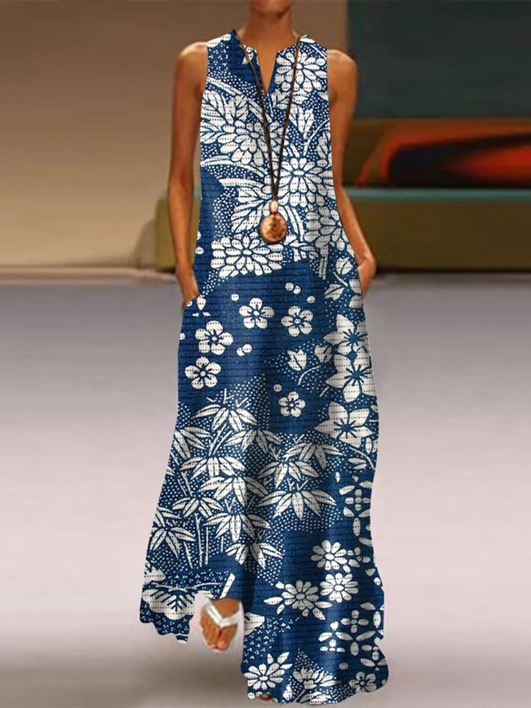 Vintage Japanese Art Flower Print V-Neck Sleeveless Maxi Dress