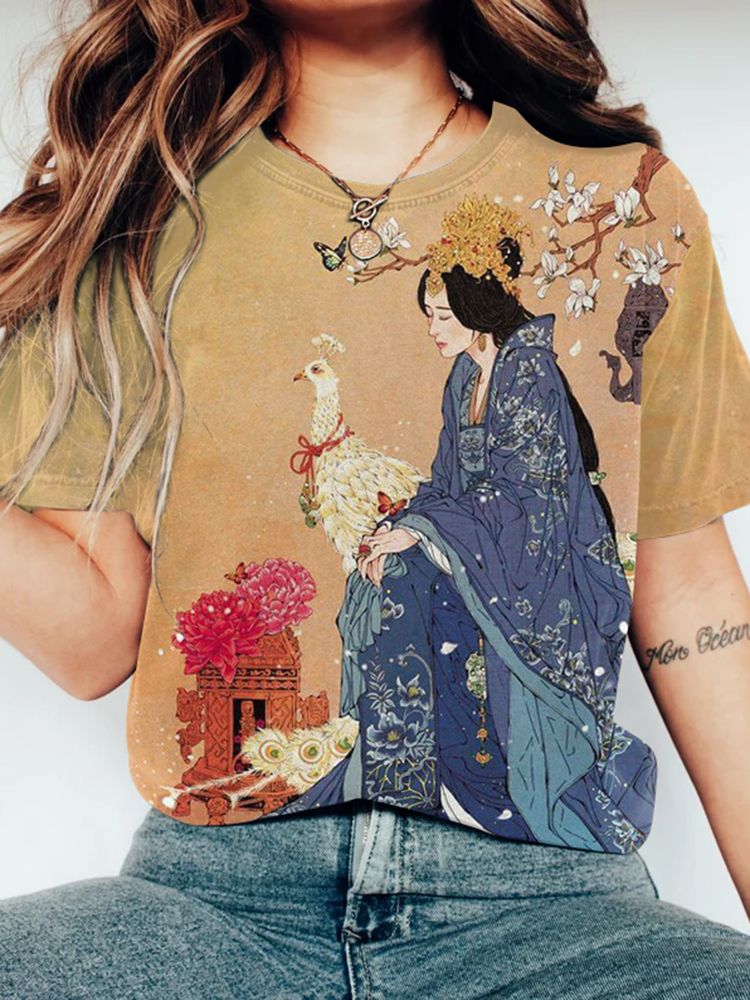 Vintage Japanese Art Geisha Round Neck Casual T-Shirt