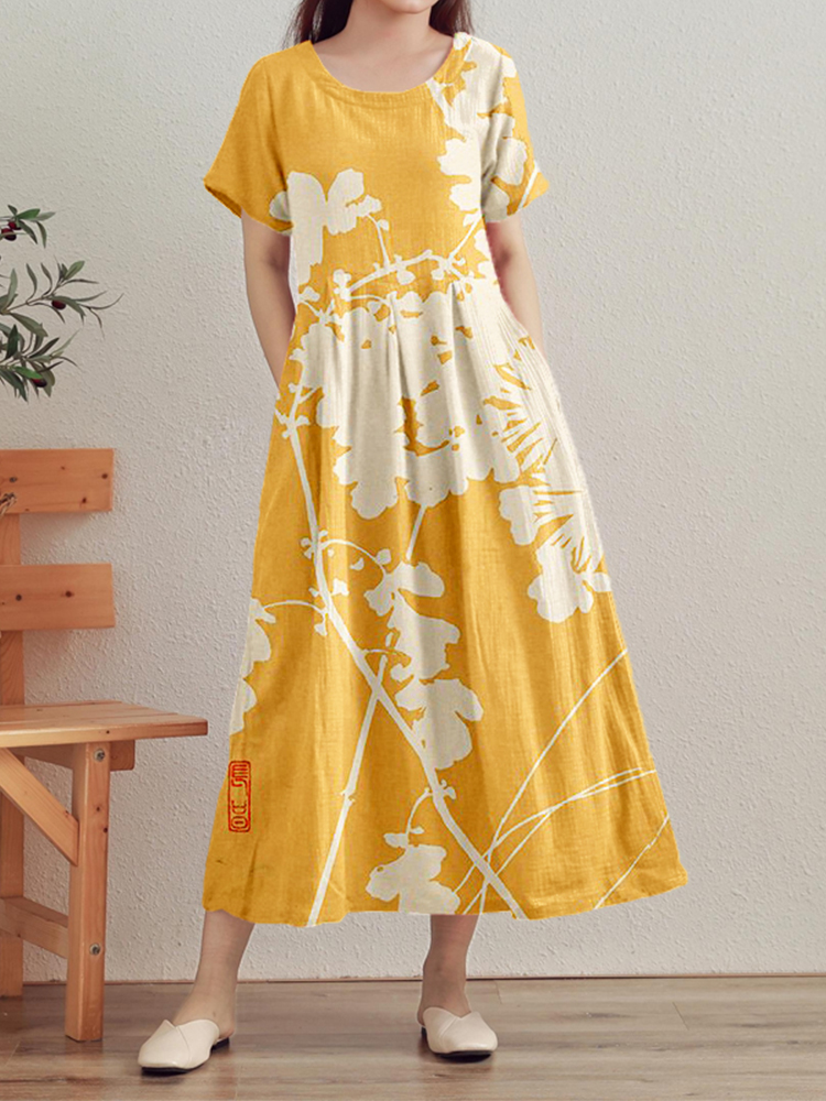 Vintage Japanese Art Pattern Linen Maxi Dress