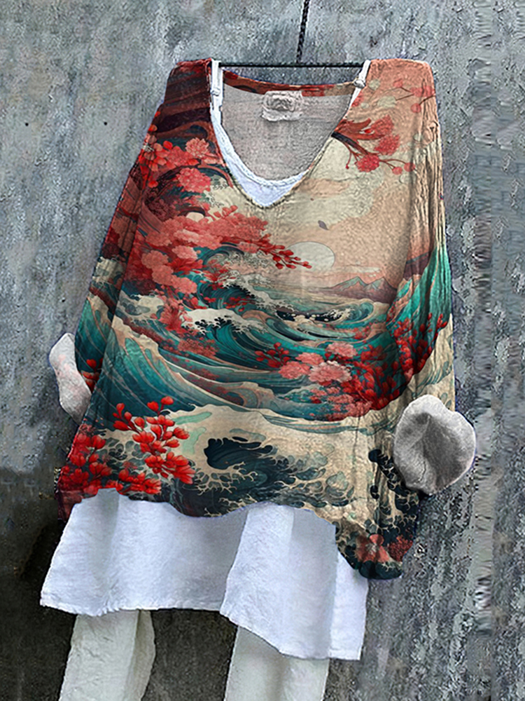 Vintage Japanese Art Printed V-Neck Long Sleeve T-Shirt