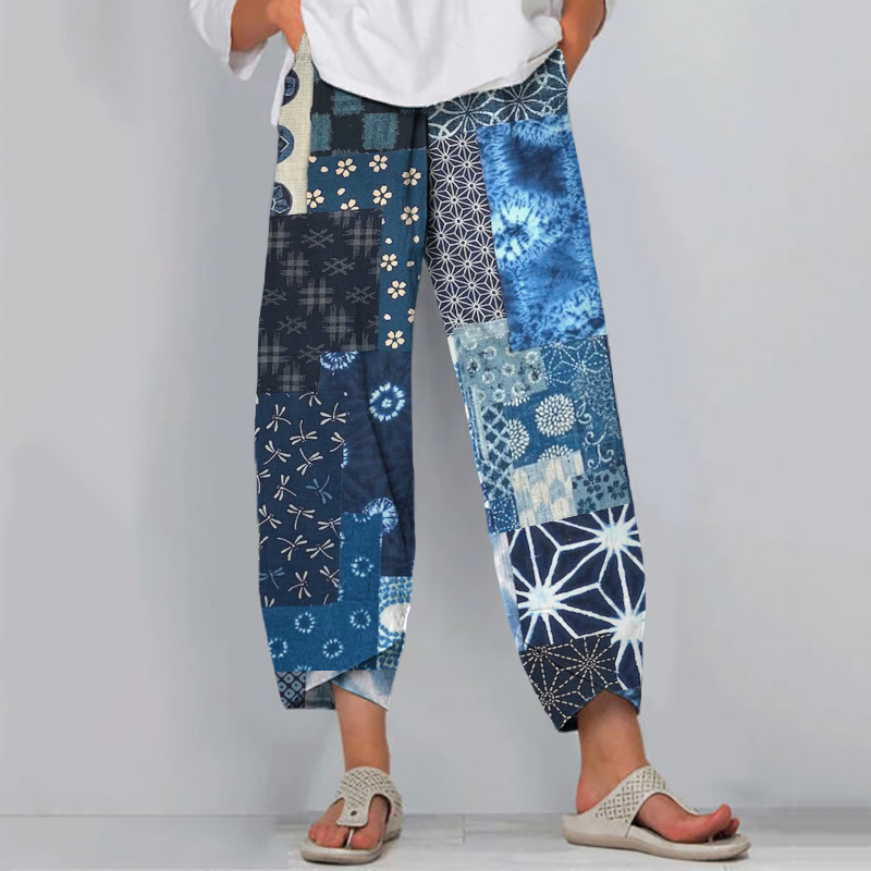 Vintage Japanese Blooming Traditional Sashiko Patchwork Art Cropped Casual Pants
