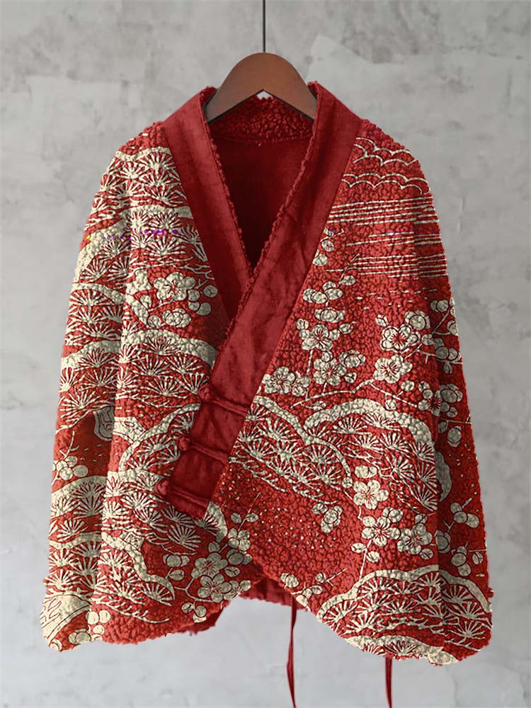 Vintage Japanese Floral Art Cozy Fleece Kimono Cardigan