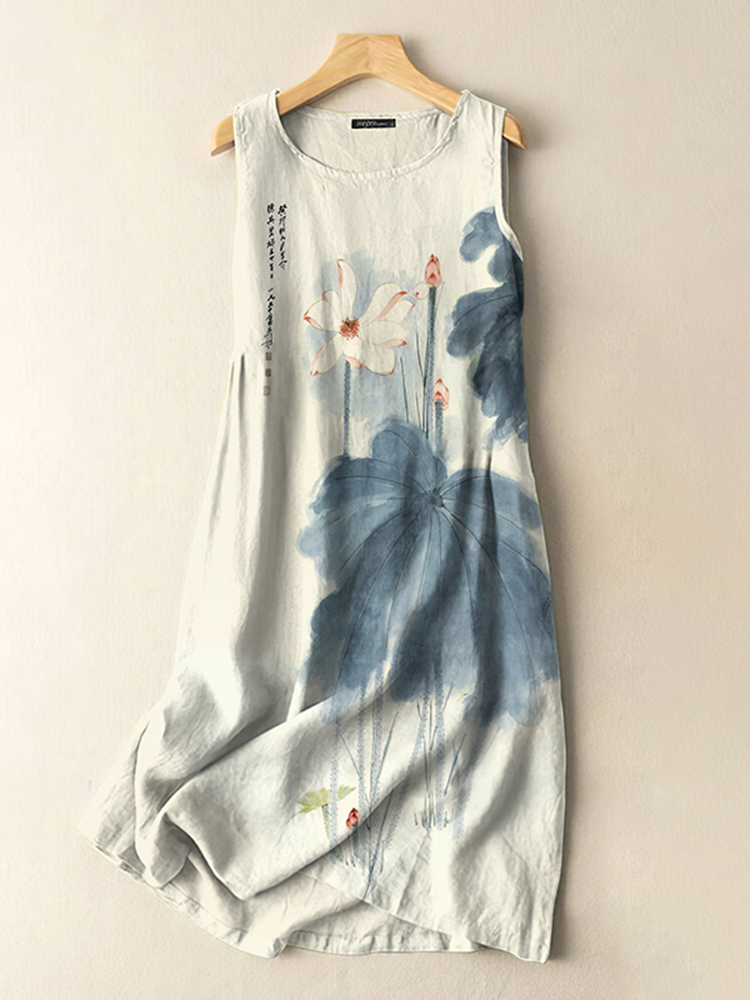 Vintage Japanese Ink Lotus Print Sleeveless Cotton And Linen Midi Dress