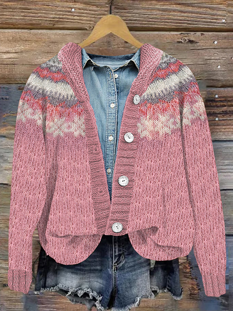 Vintage Snowflake Wave Print Button Hooded Knitted Cardigan