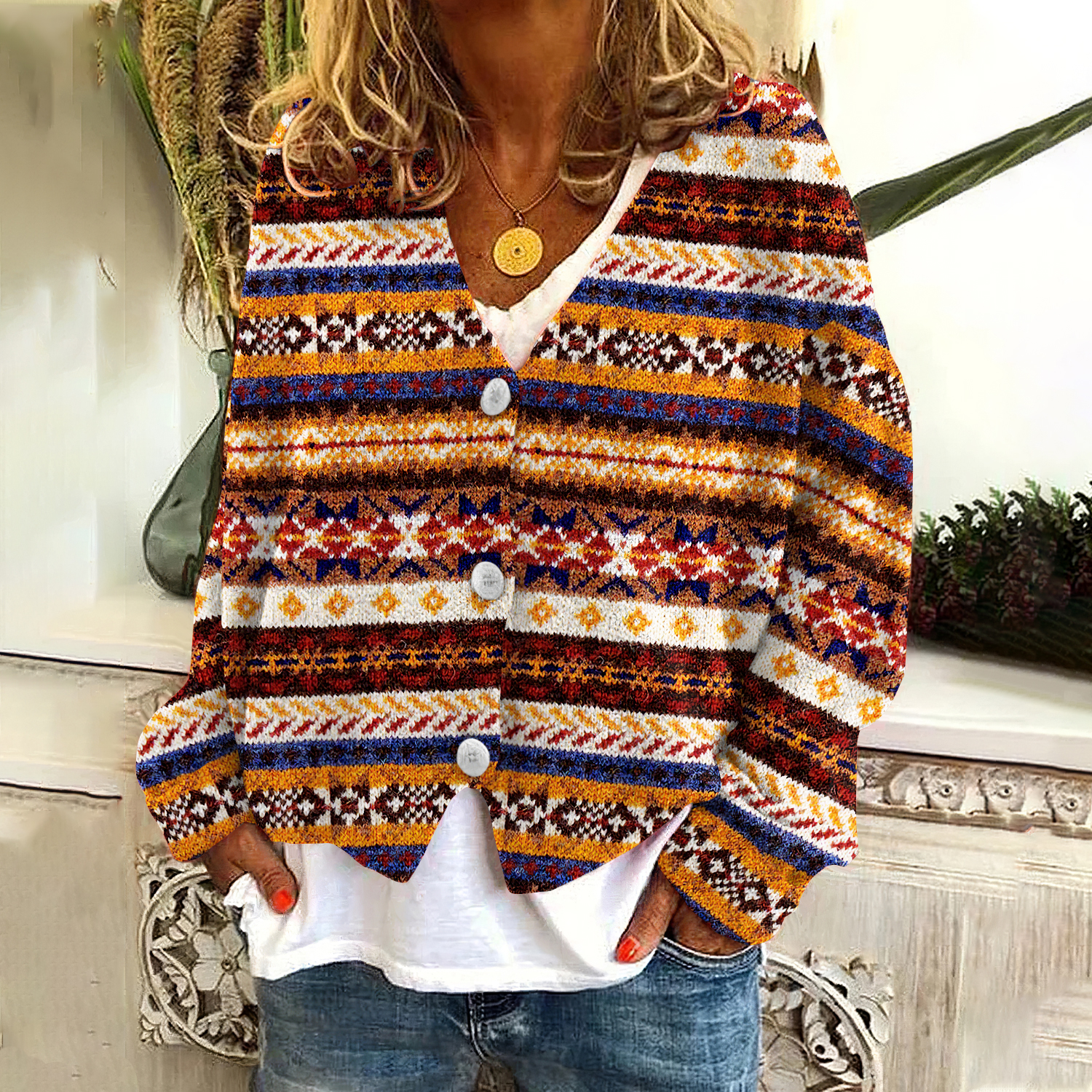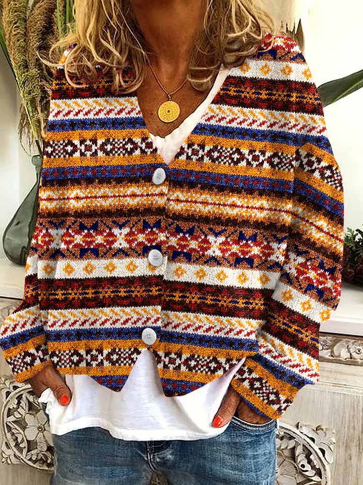 Vintage Stripes Icelandic Pattern V Neck Cozy Button Sweater