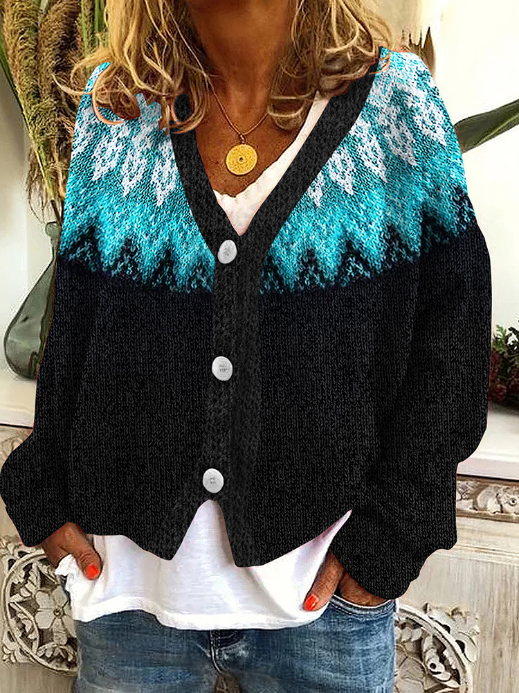 Vintage Tribal Icelandic Pattern Cozy V-Neck Long Sleeved Knitted Cardigan