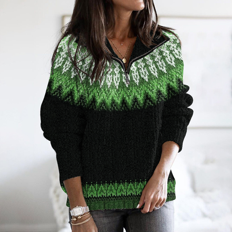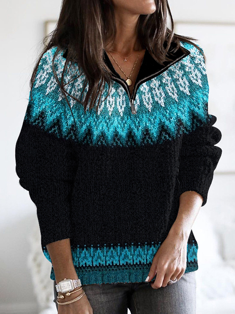 Vintage Tribal Icelandic Pattern Stand Collar Zip Sweater