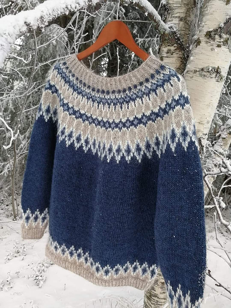 Vintage Warmth Norjalainen Knit Jacquard Icelandic Crew Neck Sweater