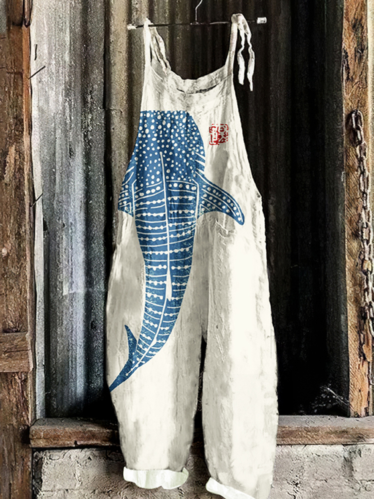 Vintage Whale Art Loose Casual Jumpsuit