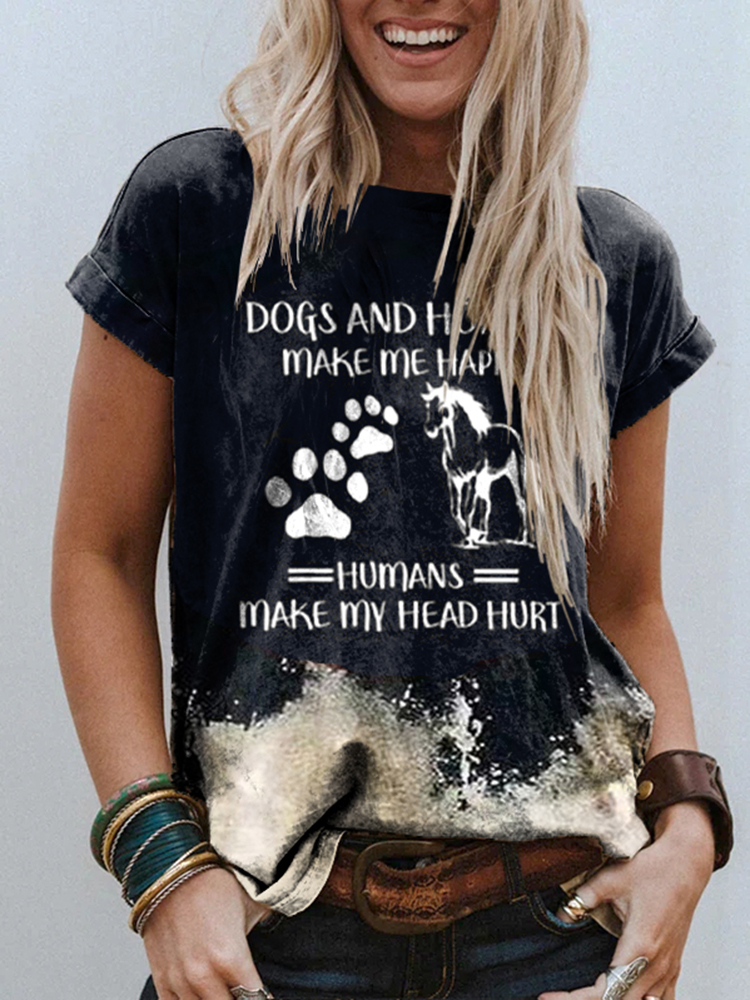 Western Dogs And Horses Make Me Happy Printed Short Sleeve T-Shirt
