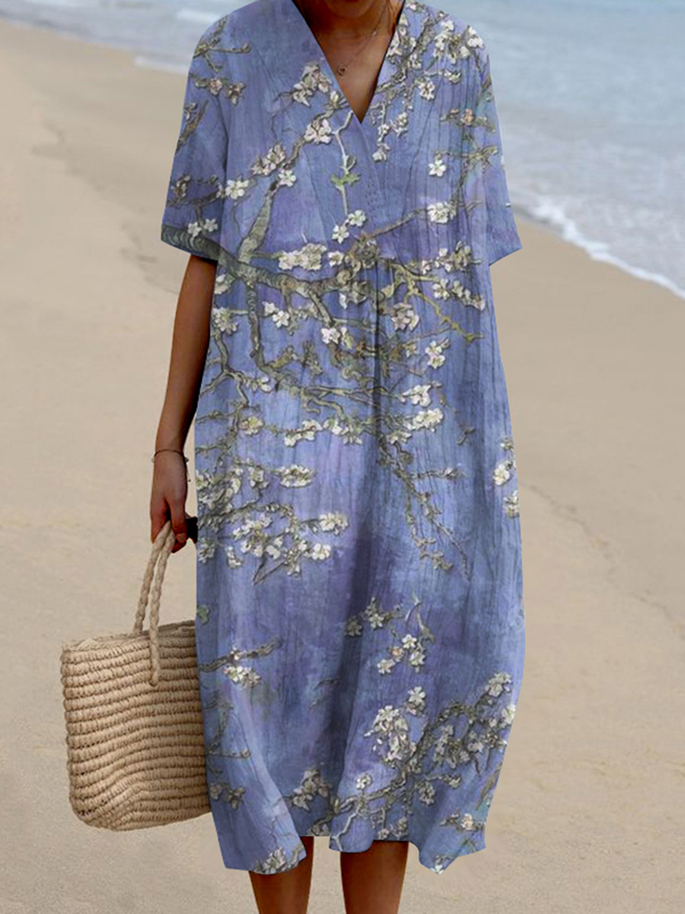 Women Floral Art Printed Casual Midi Dress