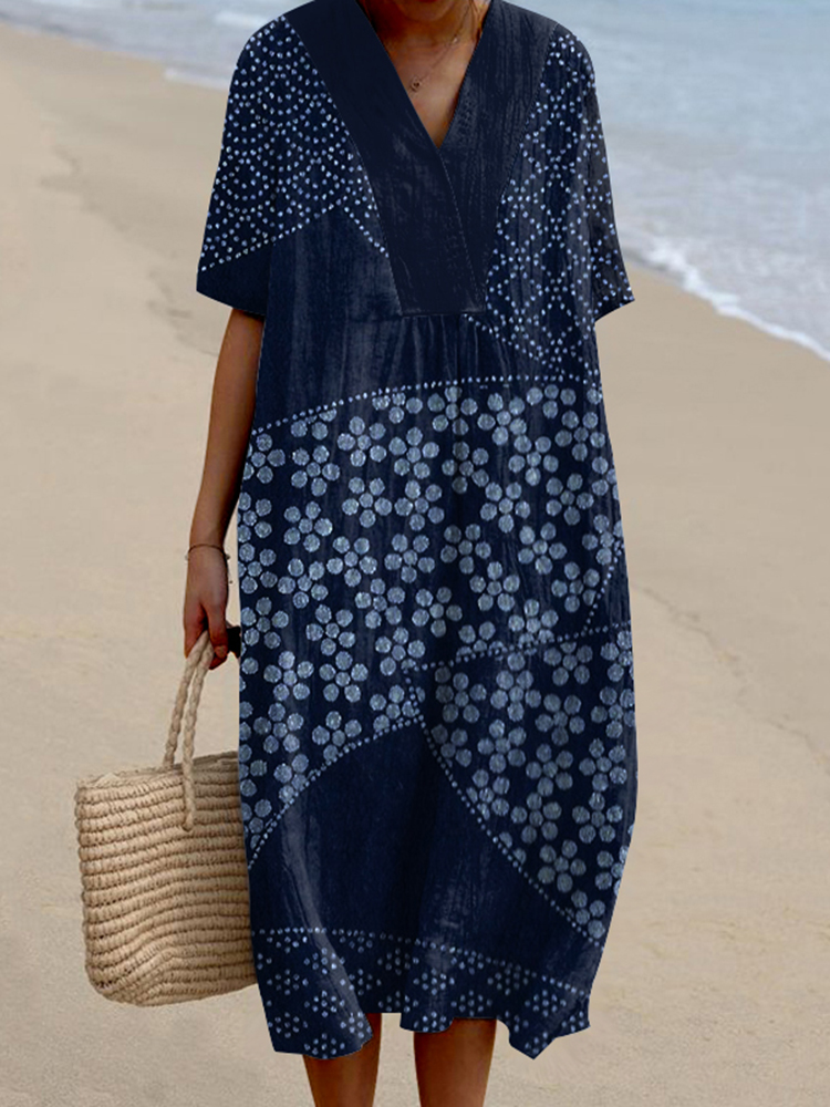 Women Geometry Floral Art Printed Casual V Neck Midi Dress