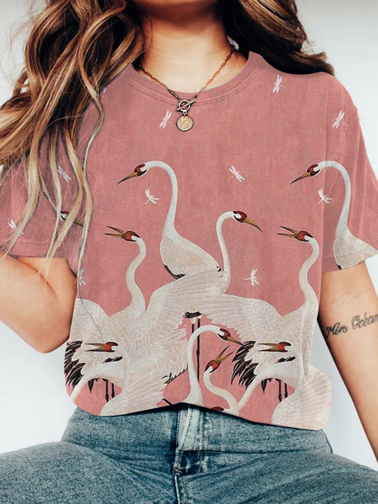 Women Japanese Art Crane Printed Round Neck T-Shirt