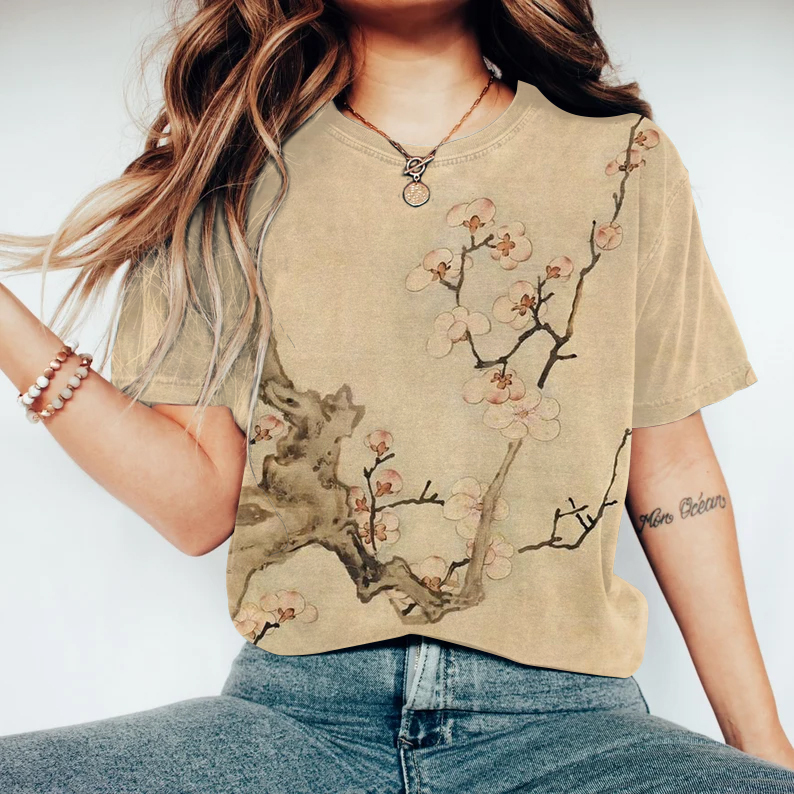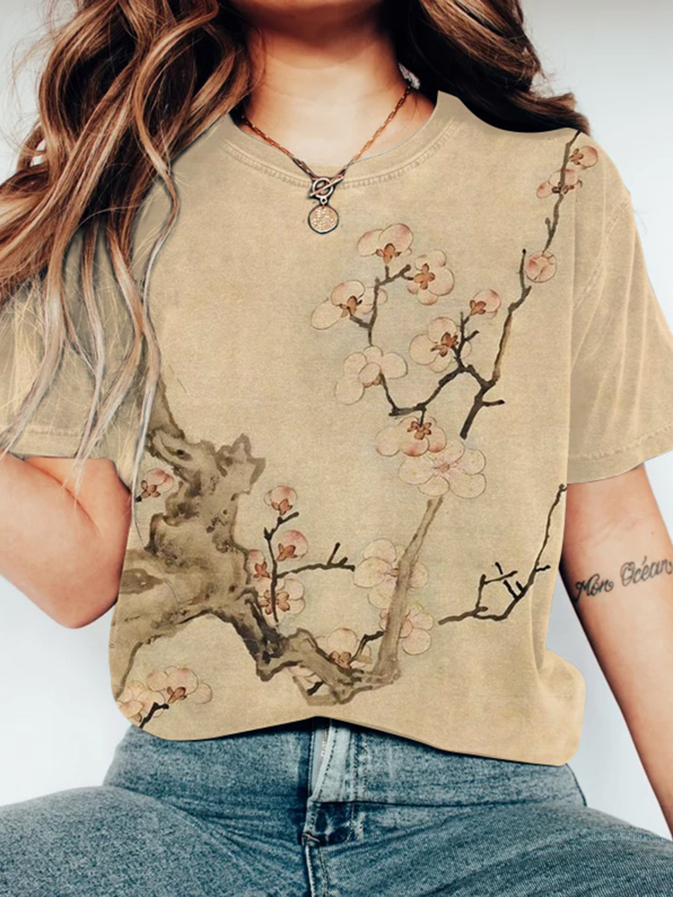 Women Japanese Art Peach Blossom Printed Round Neck T-Shirt