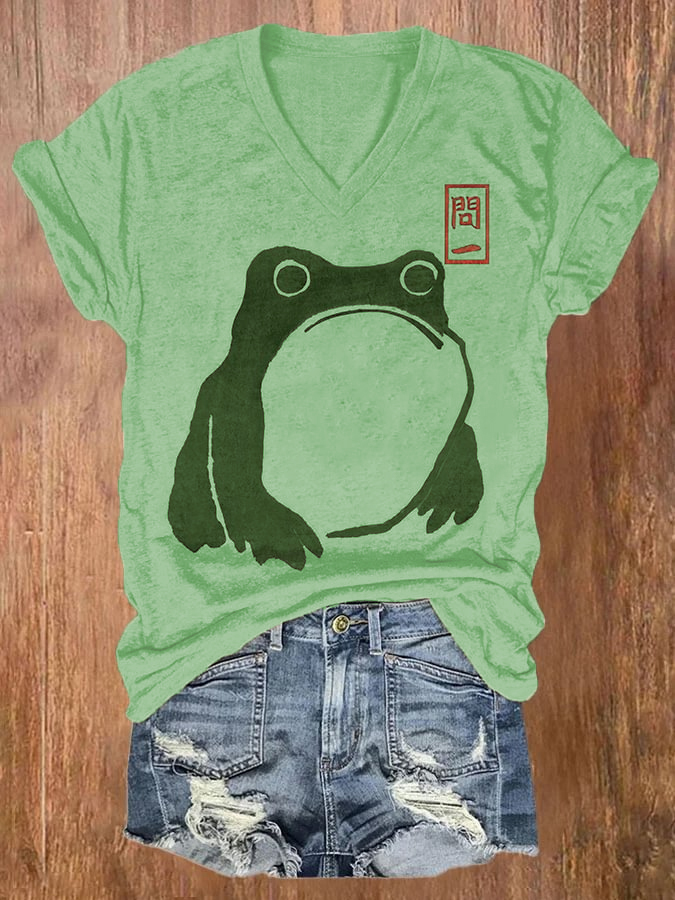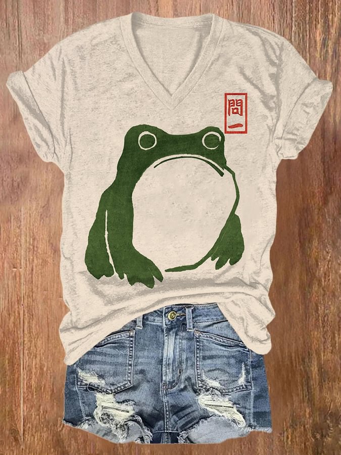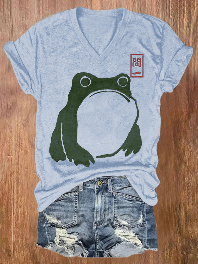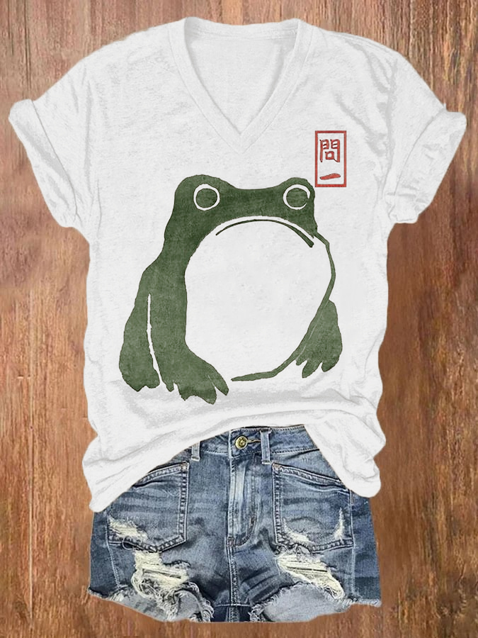 Women's Cute Frog Japanese Lino Art Painting Printed Casual T-Shirt