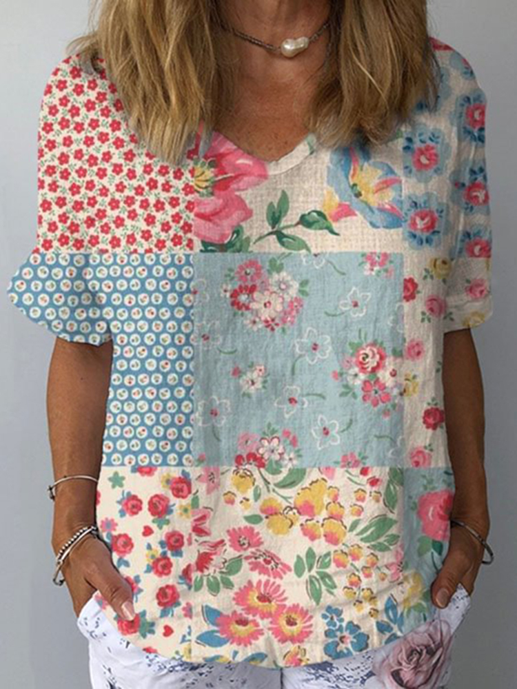 Women's Floral Loose Short Sleeve Linen Tops