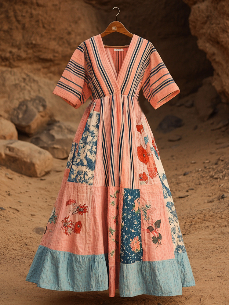 Women's Retro Striped Floral Stitching Cotton And Linen Short Sleeve Dress