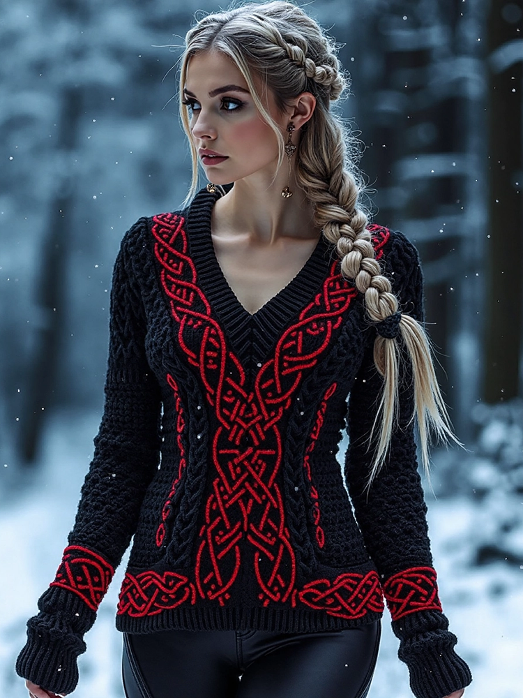 Women's Viking Celtic Knot Pattern V-neck Cozy Knit Sweater