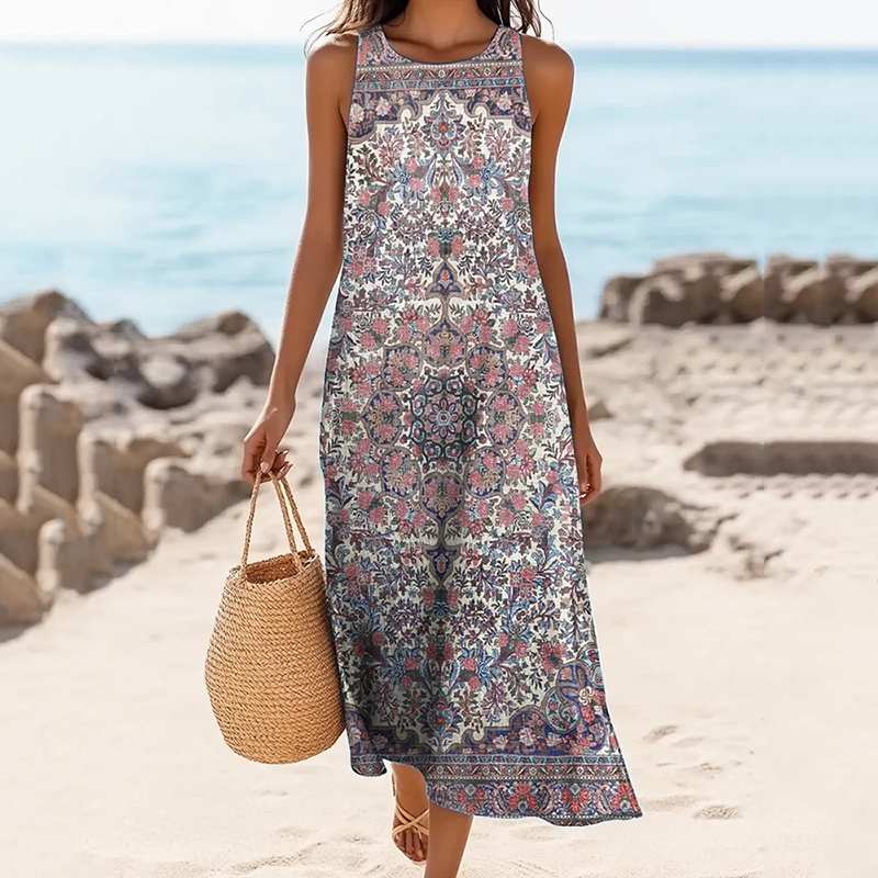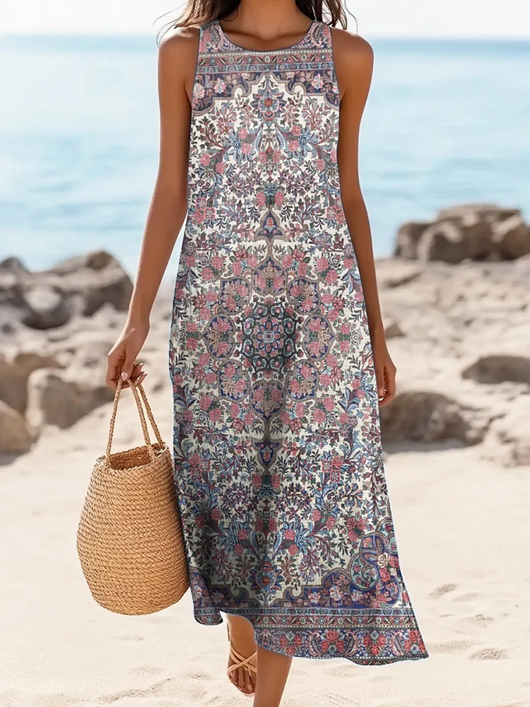 Women's Vintage Ethnic Floral Print Linen Blend Tank Midi Dress